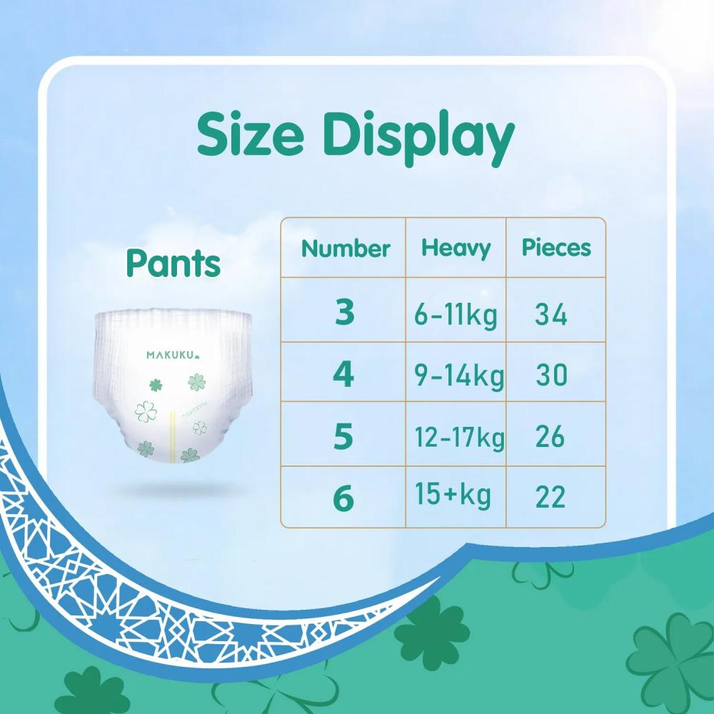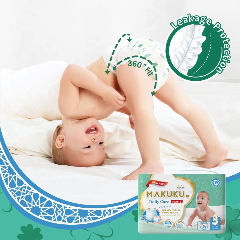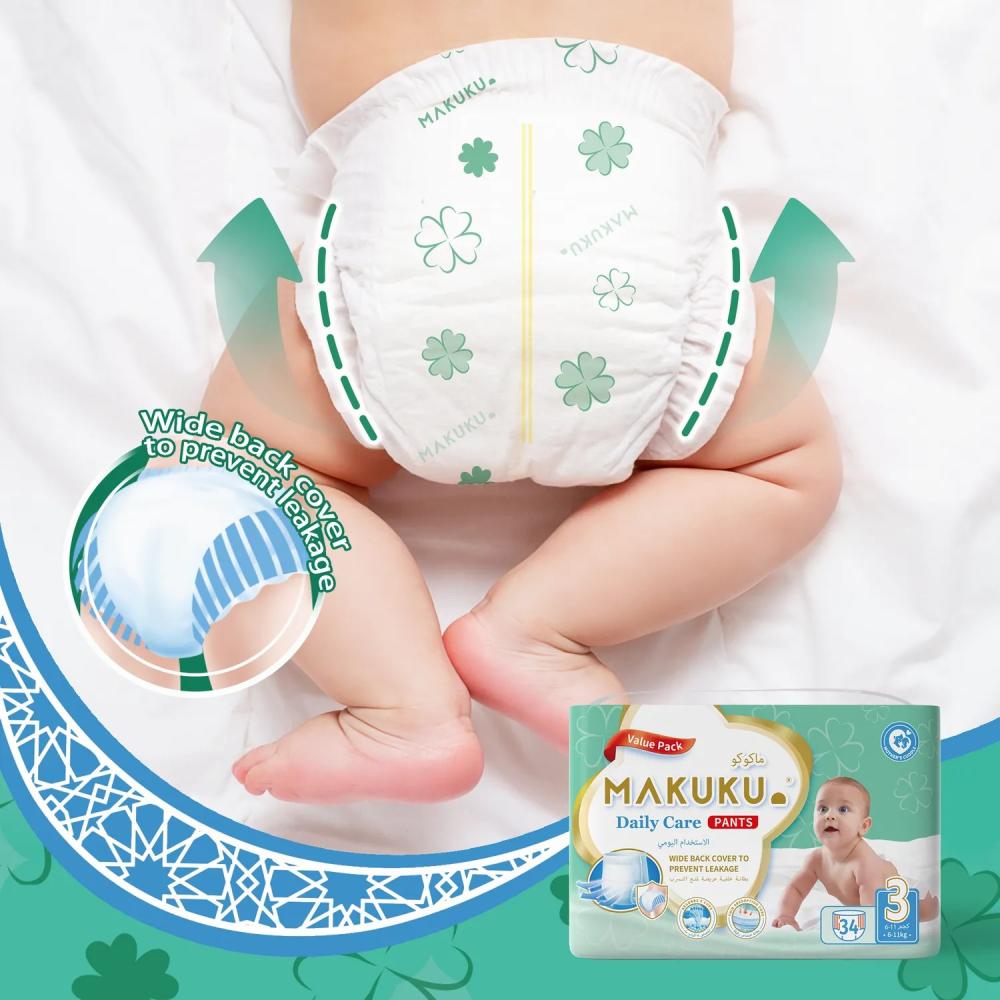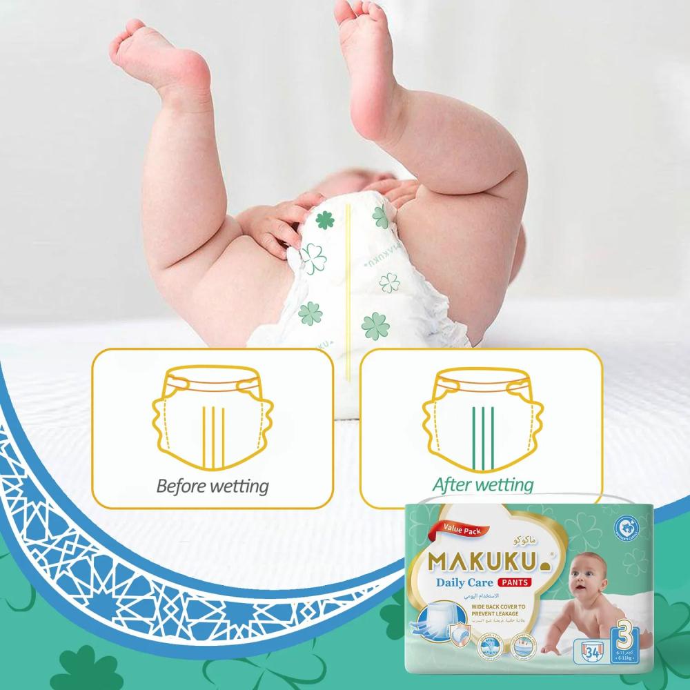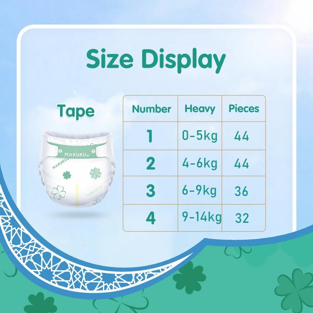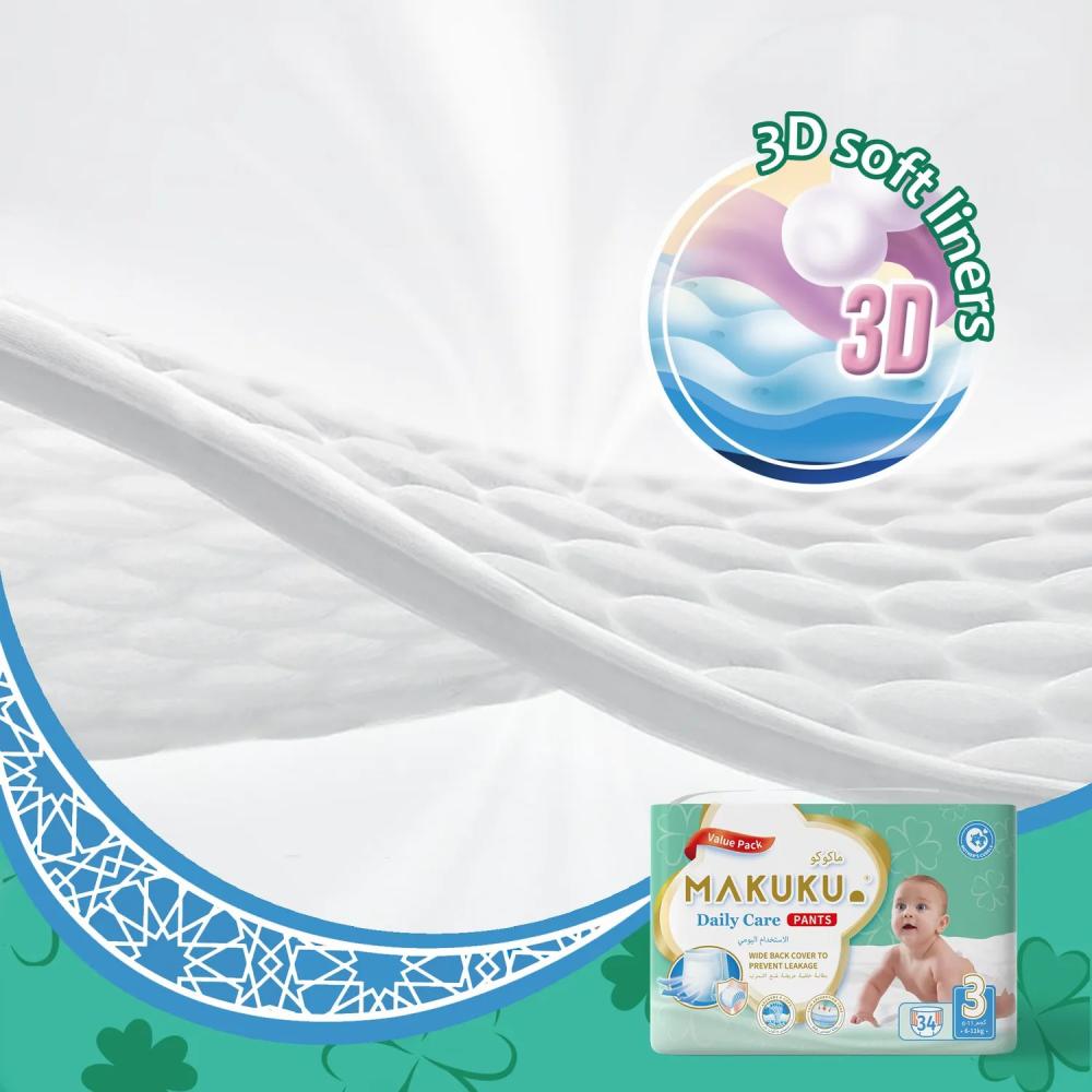 • حفاضات ماكوكو دايلي كير صديقة للبشرة؛ و قد تم تصميمها بسطح ثلاثي الأبعاد و سطح تجويف هوائي يقلل الاحتكاك لحماية بشرة طفلك الحساسة.