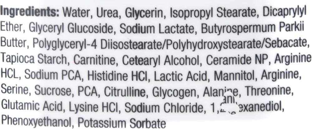 ماء، يوريا، جليسرين، إيزوبروبيل ستيرات، ثنائي كابريليل إيثر، جلوكوزيد الجليسريل، لاكتات الصوديوم، زبدة الشيا (Butyrospermum Parkii)، بولي جليسريل-4 ثنائي إيزوستيرات/بولي هيدروكسي ستيرات/سيباكات، نشا التابيوكا، كارنيتين، كحول السيتياريل، سيراميد NP، أرجينين HCL، صوديوم PCA، هيستيدين HCI، حمض اللاكتيك، مانيتول، أرجينين، سيرين، سكروز، PCA، سيترولين، جليكوجين، ألانين، ثريونين، حمض الجلوتاميك، لايسين HCI، كلوريد الصوديوم، 1,2-هيكسانديول، فينوكسي إيثانول، سوربات البوتاسيوم.